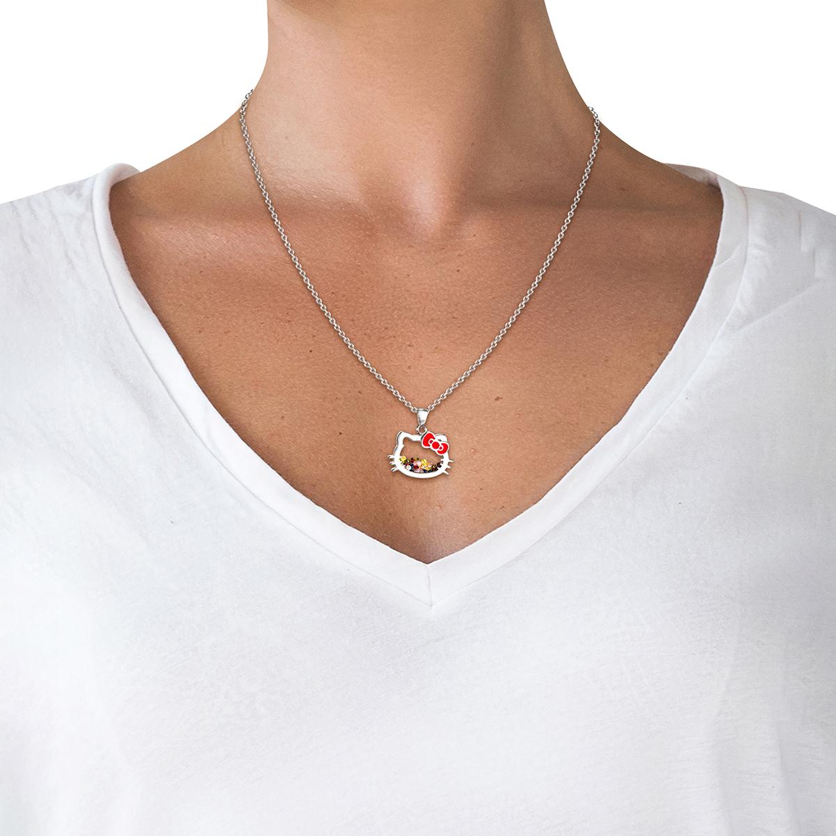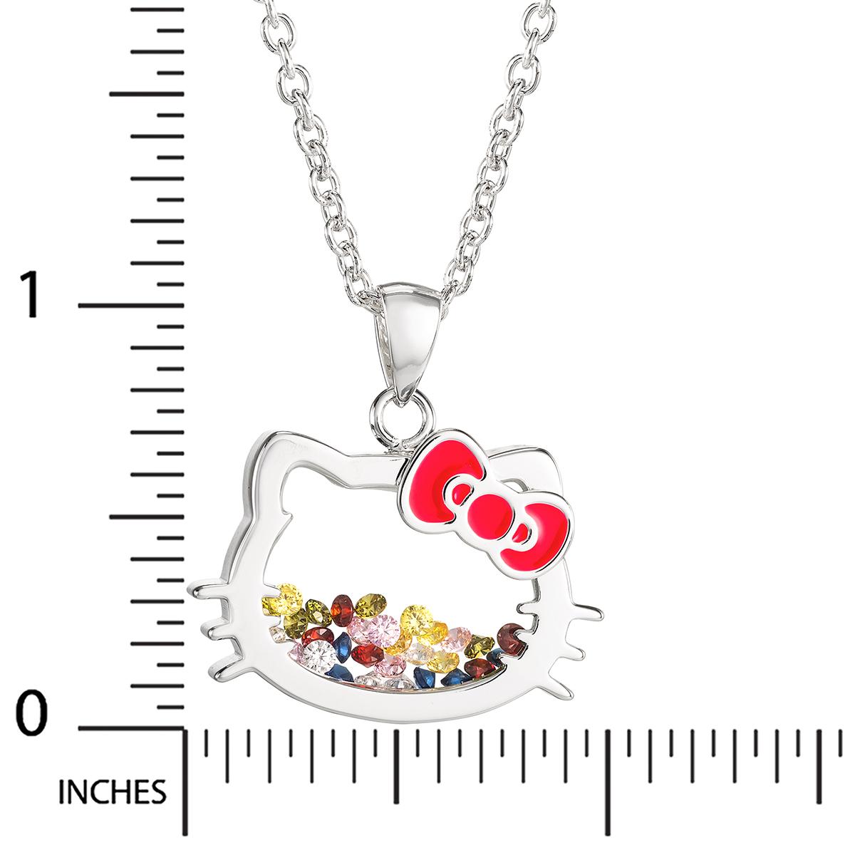 Perfect for Hello Kitty(R) enthusiasts of all ages, this necklace is ideal for adding a touch of nostalgia and charm to any outfit. Whether worn as a statement piece or as a thoughtful gift, it brings joy and whimsy to everyday wear. The pendant is adorned with multi-color stones that add vibrancy and sparkle, creating a captivating shaker effect inside the pendant. Shake gently, and watch as the stones move, adding an interactive and playful element to the necklace. Chain Length: 18"+ 2" Extender.
