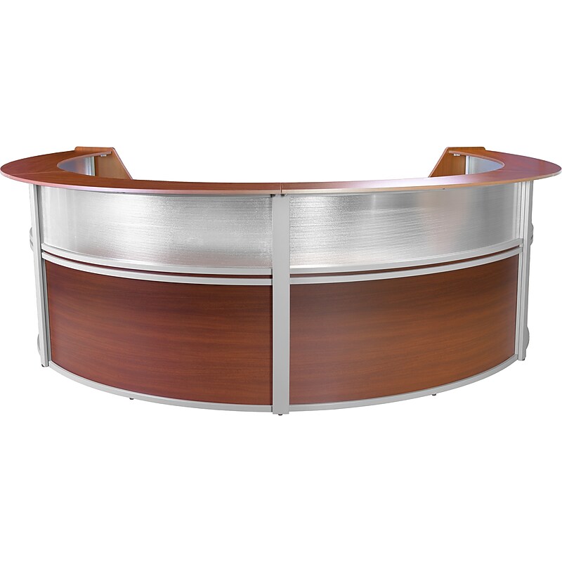 Greet visitors properly with the amazing Regency Marque reception collection! Introducing the ultimate reception desk solution, a beautifully designed, easy-to-assemble curved office desk. With its advanced thermally fused melamine finish and self-edge, this desk is not only functional but also a stunning addition to any office space. The sleek silver-tone frame adds a touch of modernity and sophistication, making it the perfect piece to impress clients and guests. Greet visitors properly with this curved four-unit reception desk workstation. Features a cutting-edge thermally fused melamine finish with self-edge and translucent polycarbonate panel; comes in afinish with a silver-tone frame. Dimensions: 45. 5"H x 142"W x 103"D. Comes with wire management cutouts on the interior desk to keep your work area tidy. Assembly required (no tools needed). Features a spacious 19. 75"D interior desk for your receptionist. Leveling glides allow for height adjustments up to 0. 5" on uneven floors.