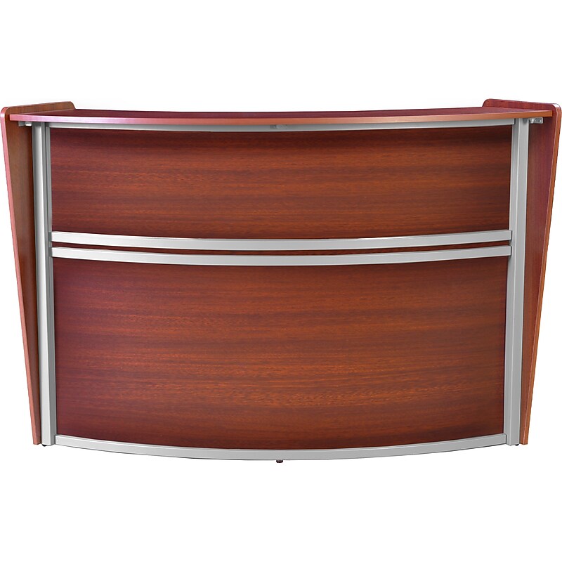 Greet visitors properly with the amazing Regency Marque reception collection! Introducing the ultimate reception desk solution, a beautifully designed, easy-to-assemble curved office desk. With its advanced thermally fused melamine finish and self-edge, this desk is not only functional but also a stunning addition to any office space. The sleek silver-tone frame adds a touch of modernity and sophistication, making it the perfect piece to impress clients and guests. Greet visitors properly with this curved single-unit reception desk workstation. Features a cutting-edge thermally fused melamine finish with self-edge; comes in afinish with a silver-tone frame. Dimensions: 45. 5"H x 72"W x 32"D. Comes with wire management cutouts on the interior desk to keep your work area tidy. Assembly required (no tools needed). Features a spacious 19. 75"D interior desk for your receptionist. Leveling glides allow for height adjustments up to 0. 5" on uneven floors.