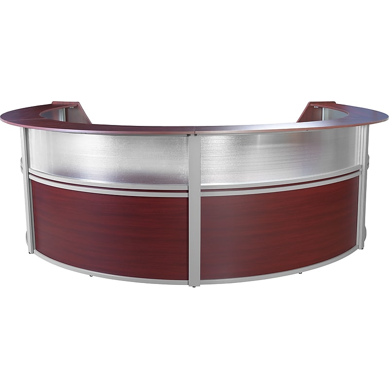Greet visitors properly with the amazing Regency Marque reception collection! Introducing the ultimate reception desk solution, a beautifully designed, easy-to-assemble curved office desk. With its advanced thermally fused melamine finish and self-edge, this desk is not only functional but also a stunning addition to any office space. The sleek silver-tone frame adds a touch of modernity and sophistication, making it the perfect piece to impress clients and guests. Greet visitors properly with this curved four-unit reception desk workstation. Features a cutting-edge thermally fused melamine finish with self-edge and translucent polycarbonate panel; comes in afinish with a silver-tone frame. Dimensions: 45. 5"H x 142"W x 103"D. Comes with wire management cutouts on the interior desk to keep your work area tidy. Assembly required (no tools needed). Features a spacious 19. 75"D interior desk for your receptionist. Leveling glides allow for height adjustments up to 0. 5" on uneven floors.
