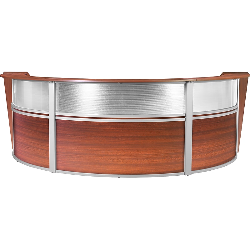 Greet visitors properly with the amazing Regency Marque reception collection! Introducing the ultimate reception desk solution, a beautifully designed, easy-to-assemble curved office desk. With its advanced thermally fused melamine finish and self-edge, this desk is not only functional but also a stunning addition to any office space. The sleek silver-tone frame adds a touch of modernity and sophistication, making it the perfect piece to impress clients and guests. Greet visitors properly with this curved triple-unit reception desk workstation. Features a cutting-edge thermally fused melamine finish with self-edge and translucent polycarbonate panel; comes in afinish with a sleek silver-tone frame. Dimensions: 45. 5"H x 143. 5"W x 71"D. Comes with wire management cutouts on the interior desk to keep your work area tidy. Assembly required (no tools needed). Features a spacious 19. 75"D interior desk for your receptionist. Leveling glides allow for height adjustments up to 0. 5" on uneven floors.