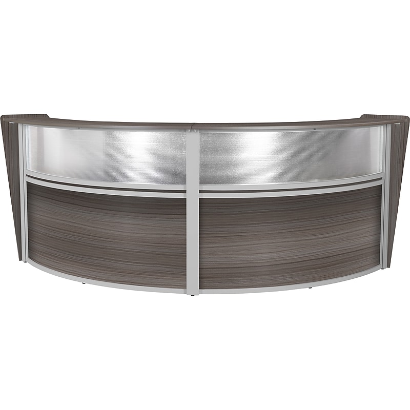 Greet visitors properly with the amazing Regency Marque reception collection! Introducing the ultimate reception desk solution - beautifully designed, easy-to-assemble curved office desk. With its advanced thermofused melamine finish and self-edge, this desk is not only functional but also a stunning addition to any office space. The sleek silver frame adds a touch of modernity and sophistication, making it the perfect piece to impress clients and guests. Greet visitors properly with this curved double-unit reception desk workstation. Features a cutting-edge thermally fused melamine finish with self-edge and translucent polycarbonate panel; comes finish with a silver-tone frame. Dimensions: 45. 5"H x 124. 5"W x 49"D. Comes with wire management cutouts on interior desk to keep your work area tidy. Assembly required (no tools needed). Spacious 19. 75"D interior desk for your receptionist. Leveling glides allow for height adjustments up to 0. 5" on uneven floors.