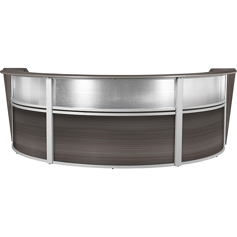 Greet visitors properly with the amazing Regency Marque reception collection! Introducing the ultimate reception desk solution, a beautifully designed, easy-to-assemble curved office desk. With its advanced thermally fused melamine finish and self-edge, this desk is not only functional but also a stunning addition to any office space. The sleek silver-tone frame adds a touch of modernity and sophistication, making it the perfect piece to impress clients and guests. Greet visitors properly with this curved triple-unit reception desk workstation. Features a cutting-edge thermally fused melamine finish with self-edge and translucent polycarbonate panel; comes in afinish with a sleek silver-tone frame. Dimensions: 45. 5"H x 143. 5"W x 71"D. Comes with wire management cutouts on the interior desk to keep your work area tidy. Assembly required (no tools needed). Features a spacious 19. 75"D interior desk for your receptionist. Leveling glides allow for height adjustments up to 0. 5" on uneven floors.