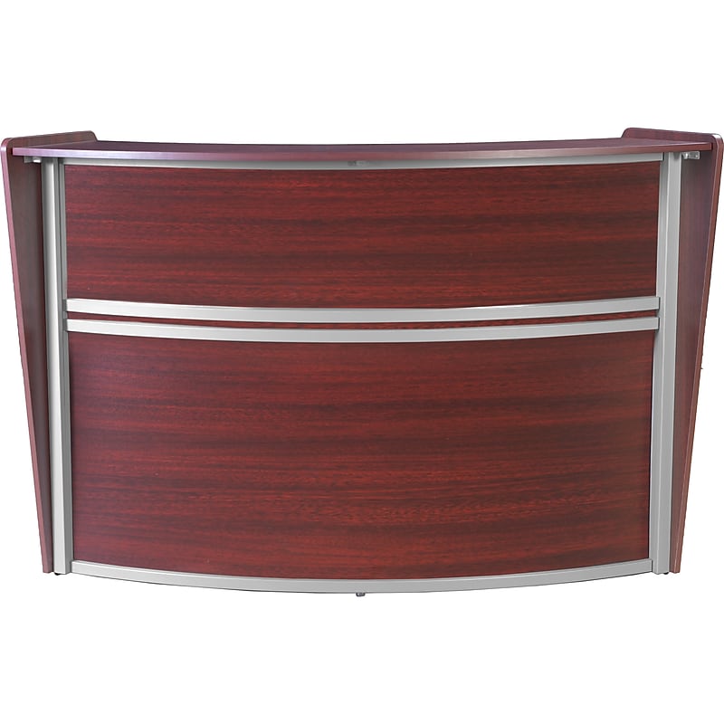 Greet visitors properly with the amazing Regency Marque reception collection! Introducing the ultimate reception desk solution, a beautifully designed, easy-to-assemble curved office desk. With its advanced thermally fused melamine finish and self-edge, this desk is not only functional but also a stunning addition to any office space. The sleek silver-tone frame adds a touch of modernity and sophistication, making it the perfect piece to impress clients and guests. Greet visitors properly with this curved single-unit reception desk workstation. Features a cutting-edge thermally fused melamine finish with self-edge; comes in afinish with a silver-tone frame. Dimensions: 45. 5"H x 72"W x 32"D. Comes with wire management cutouts on the interior desk to keep your work area tidy. Assembly required (no tools needed). Features a spacious 19. 75"D interior desk for your receptionist. Leveling glides allow for height adjustments up to 0. 5" on uneven floors.
