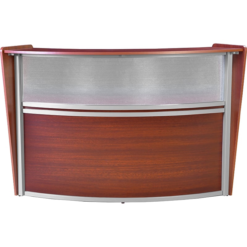 Greet visitors properly with the amazing Regency Marque reception collection! Don't worry about uneven floors, this desk comes equipped with leveling glides, allowing for a 0. 5" height adjustability, so you can work comfortably and efficiently. The best part? No tools are required for assembly, saving you valuable time and effort. Upgrade your office with the Regency curved reception desk, and experience the difference it makes in both style and functionality. Greet visitors properly with this curved single-unit reception desk workstation. Features a cutting-edge thermally fused melamine finish with self-edge and translucent polycarbonate panel; comes in afinish with a silver-tone frame. Dimensions: 45. 5"H x 72"W x 32"D. Comes with wire management cutouts on the interior desk to keep your work area tidy. Assembly required (no tools needed). Features a spacious 19. 75"D interior desk for your receptionist. Leveling glides allow for height adjustments up to 0. 5" on uneven floors.