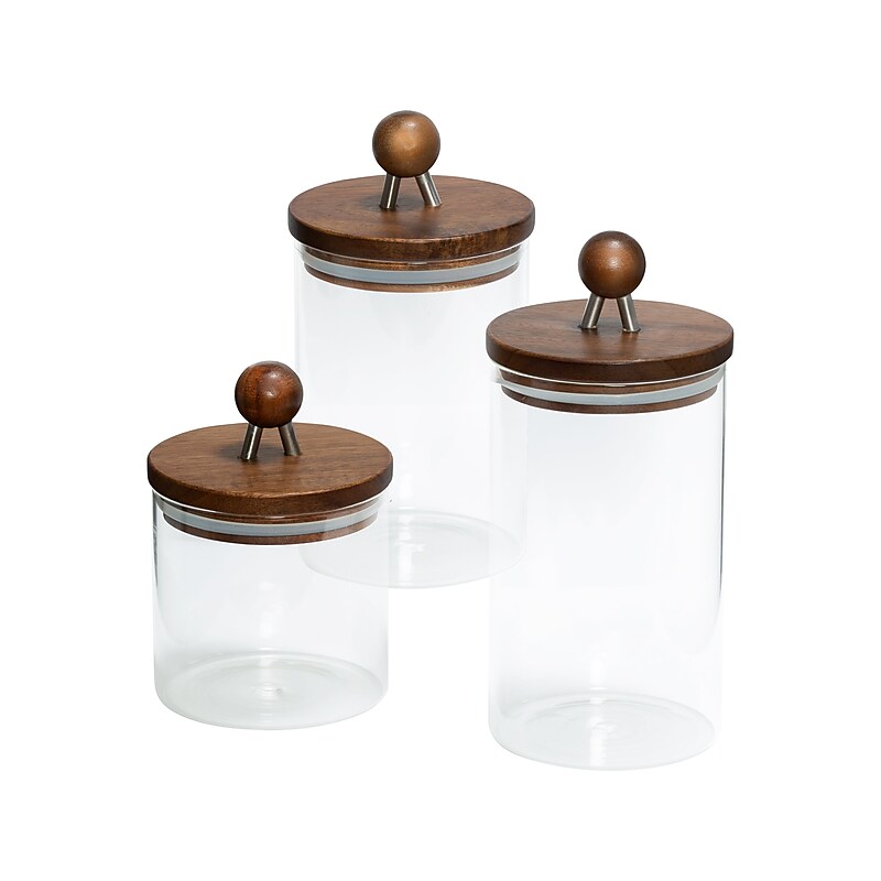 Keep your food fresh for longer with this Honey-Can-Do three-piece glass canister set that stores everything from nuts and granola to pasta and candy. Silicone rings and the acacia wood tops keep the canisters airtight, and borosilicate glass is durable for everyday use. Varying in size, the canisters range from 22 oz. (small) to 34 oz. (medium) to 40 oz. (large). Keep your food fresh for longer with this three-piece canister set that stores everything from nuts and granola to pasta and candy. Made ofdurable borosilicate glass with acacia wood tops and silicone rings. Dimensions: 9"H x 4. 25"Dia. (big canister); 8"H x 4. 25"Dia. (medium canister); 6"H x 4. 25"Dia. (small canister). Silicone rings provide airtight closure. Capacity: 22 oz. (small), 34 oz. (medium), 40 oz. (large). Three canisters per set.