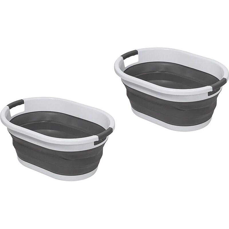 This Honey-Can-Do laundry basket in warm gray and white pops open when you're ready to use it and conveniently collapses and folds flat for easy storage when not in use. Carry loads from room to room comfortably with the soft grip handles, and fall in love with the basket's durability, as its rubber construction makes it perfect for everyday use. So go ahead, take the ugh out of the laundry. Pop-up laundry basket in warm gray and white for everyday use. Collapses for easy storage when not in use. Made of BPA-free plastic and durable rubber. Dimensions: 3. 15"-10. 83"H x 24. 02"W x 17. 72"D. Two baskets per set. Holds about two loads of laundry. Features comfort-grip handles for carrying heavy loads.