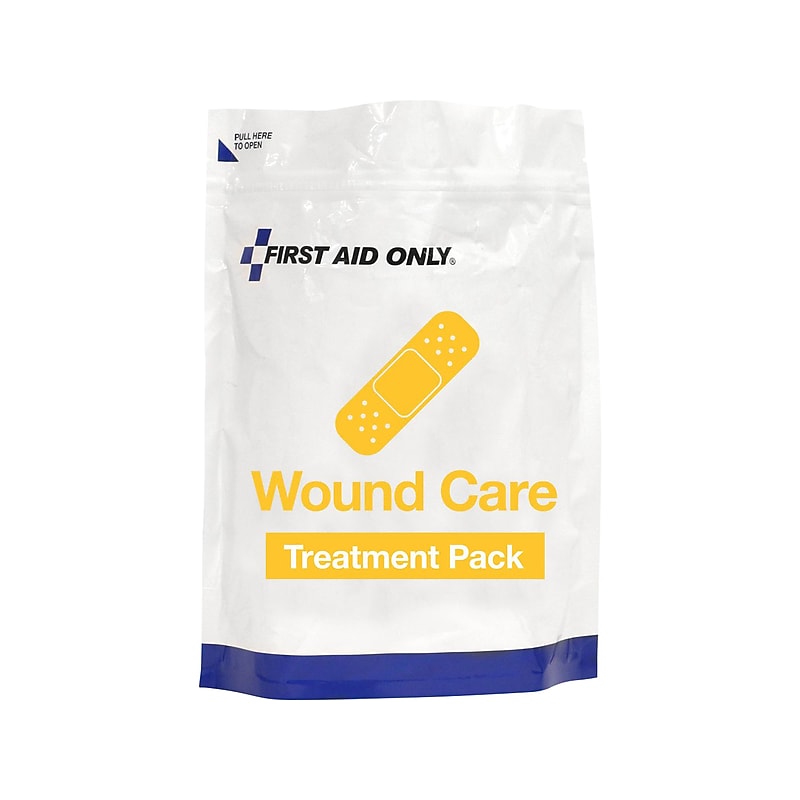 Wound Care Treatment Pack. Treats basic wounds, cuts and scrapes with plenty of bandages, gauze and antiseptic ointment. Grab-and-Go treatment pack is stand able and easy to carry to an emergency. Each first aid item's intended use is printed on the back of the bag. Bag is re-sealable. Sold as a separate treatment pack or as a refill for the 91170 Emergency Response Bag. Quick convenient kit has essential supplies to treat basic wounds.