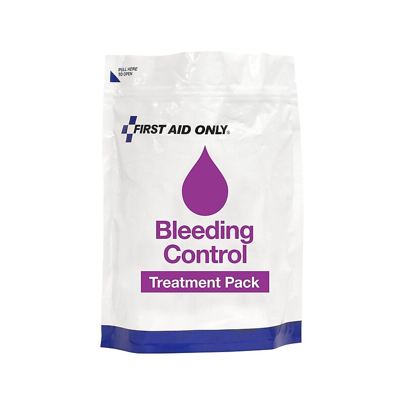 Bleeding Control Treatment Pack. Windlass tourniquet and hemostatic blood-clotting gauze pad to treat bleeding injuries. Grab-and-Go treatment pack is stand able and easy to carry to an emergency. Each first aid item's intended use is printed on the back of the bag. Bag is re-sealable. Sold as a separate treatment pack or as a refill for the 91170 Emergency Response Bag. Quick convenient kit has essential supplies to treat bleeding control emergencies.