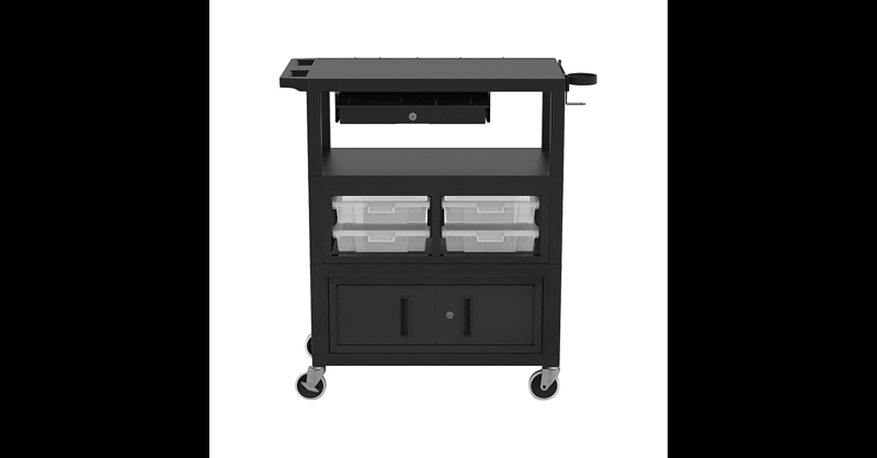 To help reduce the risk of exposure between students, many schools have adopted the practice of keeping students stationary while instructors move from classroom to classroom. Because of this, teachers need a smartly designed, highly mobile solution to take essentials with them. Meeting this challenge, Luxor has created this deluxe teacher cart. Based on the proven, best-selling EC series utility carts, this versatile traveling teacher cart offers secure storage for valuables plus accommodations for a computer, pocket chart, water bottle, teaching supplies, and much more. Made of mixed materials, this utility cart and gray allows teachers to always take essentials with them. Versatile mobile cart offers secure storage for valuables plus accommodations for a computer, pocket chart, water bottle, teaching supplies, and much more. Dimensions: 41. 75"H x 35. 6"W x 18. 25"D; weight capacity: 400 lbs. ; weight: 79. 4 lbs. Features top and middle shelves. Full assembly required. Shelf dimensions: 32"W x 18"D; clearance between top and middle shelf: 10. 5"; clearance between drawer and middle shelf: 6. 5". 15' UL- and CSA-listed three-outlet electrical assembly with cord plug snap and side-wrap hooks. Retractable keyboard/laptop tray with EVA surface is perfect for presentations. 4"Dia. full-swivel TPR casters (two with locking brakes) for an effortless glide. Two spacious shelves with retaining lip to secure items during transport. Supports up to 400 lbs. (20 lbs. per bin, evenly distributed). All-metal lockable cabinet and drawer for secure storage. Four removable and stackable storage bins. Five hooks for hanging pocket folders.