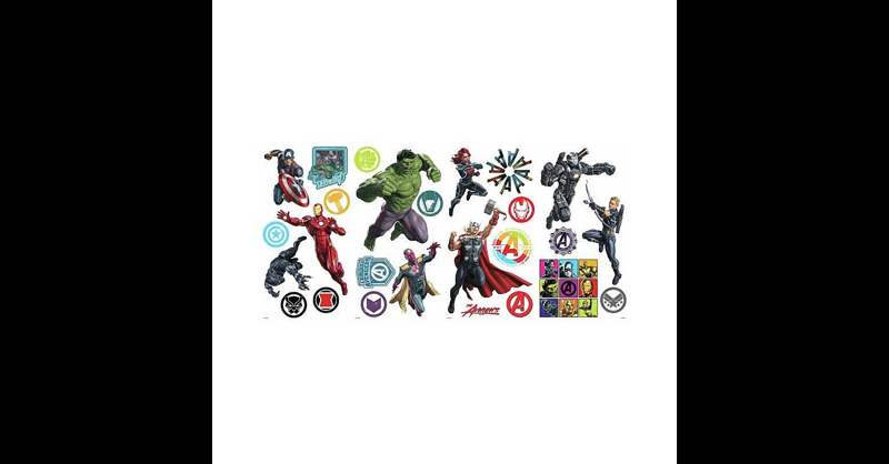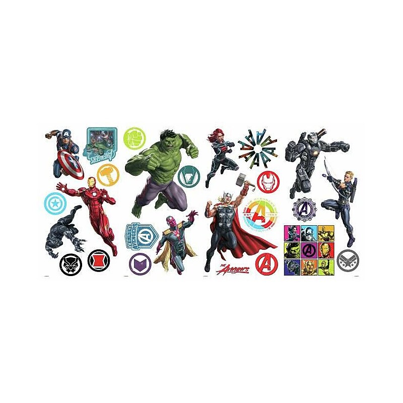 The Avengers assemble on your wall with this RoomMates Classic Avengers wall decal set. Featuring Thor, Iron Man, Captain America, Black Panther, and more classic Avengers members, these 26 decals bring epic action directly to your walls. Avengers assemble on your wall with this wall decal set. Features Thor, Iron Man, Captain America, Black Panther, and more classic Avengers members. Easily installed, backed by peel-and-stick technology. Printed on high-quality vinyl. 26 wall decals per set. Great for use in bedrooms, classrooms, offices, living spaces, kitchens, on windows, doors, furniture, and more. Sticks best to smooth, clean surfaces. Reusable and can be easily repositioned. Residue-free and safe for walls. Made in the USA.
