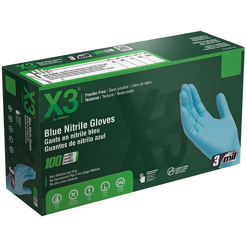 When you need disposable gloves with the strength of nitrile, balanced with excellent dexterity for lighter-duty applications, look no further than the Ammex X3nitrile powder-free industrial gloves. These gloves will change everything you thought you knew about 3-mil nitrile. They offer a level of performance you might expect from thicker gloves, with greater comfort and tactile sensitivity. The Ammex X3nitrile powder-free industrial gloves are perfect for short-duration use where frequent glove changes are required, especially for food service, janitorial, and sanitation applications. They're made of component materials that comply with the FDA regulations for food contact. They are latex-free, powder-free, and chlorinated for easy changing. Disposable powder-free industrial-grade gloves are perfect for short-duration use where frequent glove changes are required. Size: M. Made of premiumnitrile which provides a dependable barrier against cleaning solutions, paint, and a wide variety of common and specialty chemicals. Micro-roughened finish enhances grip even when wet. Complies with the FDA regulations for food contact. Nitrile has three times the puncture resistance of latex, so you can be confident your hands are protected. Latex-free, powder-free, and chlorinated for easy changing. Perfect for food service, janitorial, and sanitation applications. Thickness (palm): 3 mil. 100 gloves per box. Finger thickness: 4 mil.