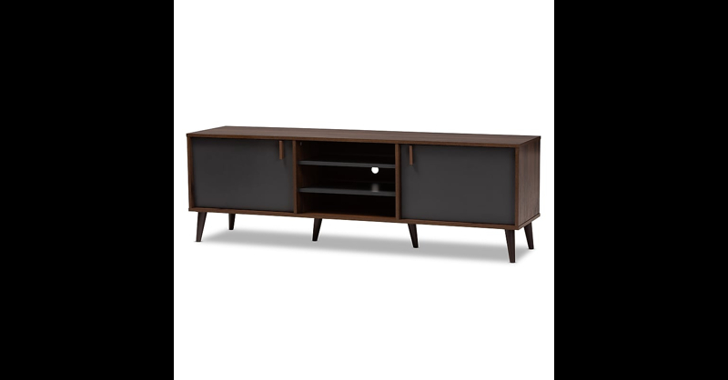 Organize your entertainment space in style with the Samuel TV stand. The modern and contemporary-inspired design elements come through in the straight lines and solid colors of the television stand. The Samuel's engineered wood frame is finished in brown with dark grey finished doors. This TV stand features five shelf spaces, three of which are in the center, with one space on each side behind a door. The back panel of the Samuel has circular cut-outs for wire management, making it easy to arrange and store your gaming consoles and media players. The TV stand rests on stylishly angled, tapered legs. Add some chic and sophisticated style to your livingroom or rec room with the Samuel TV stand. Made in Malaysia, the TV stand requires assembly. Modern and contemporary TV stand. Brown and dark grey finishing. Five shelf spaces. Two cabinet doors. Angled, tapered legs. Assembly required. Made in Malaysia. Dimensions: 20. 4" High x 63" Wide x 15. 8" Deep. Baxton Studio offers a 30-Day parts replacement warranty on all items. If you experience any issue with your product, please contact us ordersupport@wholesale-interiors. com. ⚠ WARNING: California Proposition 65 Warning. This product can expose you to chemicals including lead, which are known to the State of California to cause cancer and birth defects or other reproductive harm. For more information go to www. P65Warnings. ca. gov.