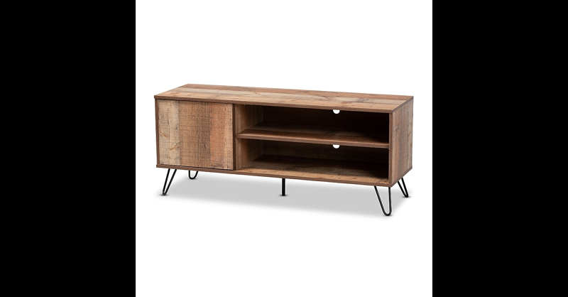 A retro silhouette is paired with rustic tones to give the Iver TV stand a unique, contemporary look. Constructed from wood, the Iver features a rustic oak-tone finish for an aged appearance. Two spacious shelves, fitted with cord management holes, provide room to store entertainment consoles. Additional storage space is found behind one door. Black metal hairpin legs add a cool, modern feel. The Iver TV stand is made in Malaysia and requires assembly. Constructed from engineered wood and metal. Rustic oak finish. Two (2) open shelves and one (1) concealed shelf. Cord mangament holes. Black hairpin legs. Assembly required. Made in Malaysia. Dimensions: 20. 1" High x 47. 2" Wide x 15. 6" Deep; Open Shelf: 5. 9" High x 30" Wide x 14. 4" Deep; Legs: 5. 5" High; Inner Shelf: 12. 9" High x 23" Wide x 14. 4" Deep;. Baxton Studio offers a 30-Day parts replacement warranty on all items. If you experience any issue with your product, please contact us ordersupport@wholesale-interiors. com. ⚠ WARNING: California Proposition 65 Warning. This product can expose you to chemicals including lead, which are known to the State of California to cause cancer and birth defects or other reproductive harm. For more information go to www. P65Warnings. ca. gov.