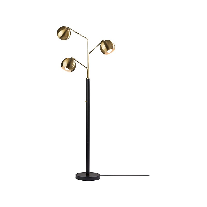 Drawing inspiration from mid-century modern designs, this Adesso Emerson sleek three-armed floor lamp features three 6. 5" globe-shaped shades and slender metal body for a minimalist touch. Antique brass arms and shades add warmth and contrast to themetal pole and base. Place this lamp next to your work space or reading area for a pop of glamour and style. Adjust the arms as well as the shades to direct the light exactly where it is needed. A rotary switch located on the pole controls the light at four settings: one light on, two lights on, three lights on, and three lights off. This allows for multiple brightness settings to satisfy all lighting needs. This floor lamp provides direct light wherever you need it. Works with three 40W incandescent bulbs with E26 medium base (not included). Overall dimensions: 68"H x 29"W x 21. 5"D. ; base size: 11"DIa. ; shade size: 6. 5"Dia. Antique brass arms and shades add warmth and contrast to themetal pole and base. Three-armed floor lamp features three globe-shaped shades. Features a 60" clear cord. Rotary switch located on the pole controls the light with four settings: one light on, two lights on, three lights on, and three lights off. Meets or exceeds the ETL standard.