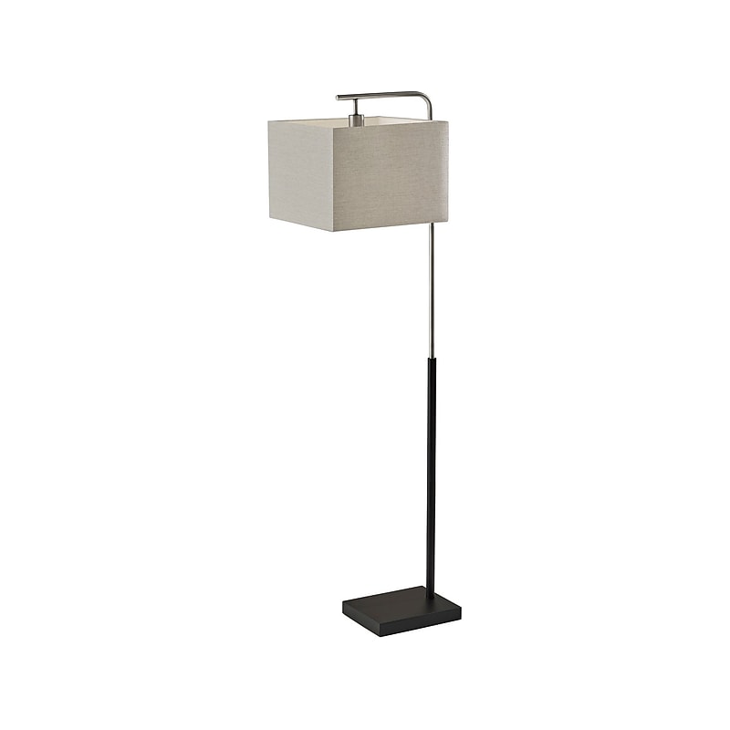 With a clean, minimal design and a simple color palette, the Adesso Flora floor lamp exudes modern style. The lamp features a rectangular base in afinish that continues up the stem before transitioning to a brushed steel finish leading to the square light taupe textured fabric shade that softly distills the light. A 100W bulb (not included) is operated by a three-way rotary switch located on the socket, allowing you to easily adjust the lighting level between low, medium, high, and off when using a three-way bulb. When using a regular bulb, the rotary switch turns the lamp on or off. The Flora floor lamp is also available inwith antique brass and an off-white textured fabric shade. With a clean, minimal design and a simple color palette, this floor lamp exudes modern style. Works with a 100W incandescent or 16W LED E26 bulb (bulb not included). Overall dimensions: 60"H x 13"W x 17. 5"D; base size: 8. 5" x 11"; shade size: 10. 5"H x 13"W x 13"D. Black finish on the base continues up the stem before transitioning to a brushed steel finish. Square light taupe textured fabric shade softly distills the light. Features a clear cord. Operated by a three-way rotary switch located on the socket, allowing you to easily adjust the lighting level between low, medium, high, and off when using a three-way bulb. Meets or exceeds the ETL standard.