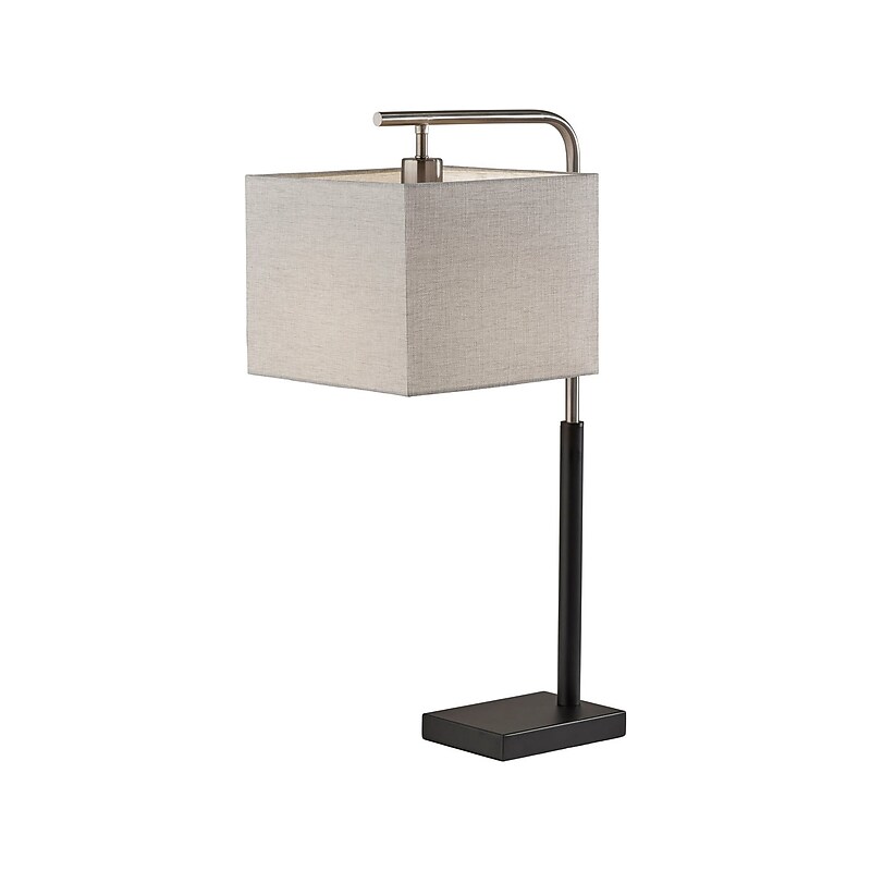 With a clean, minimal design and a simple color palette, the 26. 5" Adesso Flora table lamp exudes modern style. It features a black metal rectangular base measuring 5. 5" x 8". The black finish continues up the stem before transitioning to a brushed steel finish, leading to the textured square shade made of light taupe fabric that softly distills the light. For convenient access to AC power on your table or desk, the base includes an outlet that is subtly located on the back. The 60W bulb (not included) is operated by a rotary switch located on the socket and features a 5' clear cord. The Flora table lamp is also available with a black and antique brass finishes and a textured off-white fabric shade. Table lamp in a clean, minimal design and a simple color palette exudes modern style. Designed for a 60W incandescent or 16W LED bulb with E26 medium base (bulb not included). Overall dimensions: 26. 5"H x 10"W x 14. 5"D; shade size: 8"H x 10"W x 10"D; base size: 5. 5" x 8". Black finish continues up the stem before transitioning to a brushed steel finish, leading to the textured square shade made of light taupe fabric that softly distills the light. Features a 60" clear cord. Base includes an outlet subtly located on the back for convenient access to AC power on your table or desk. Meets or exceeds the ETL standard.
