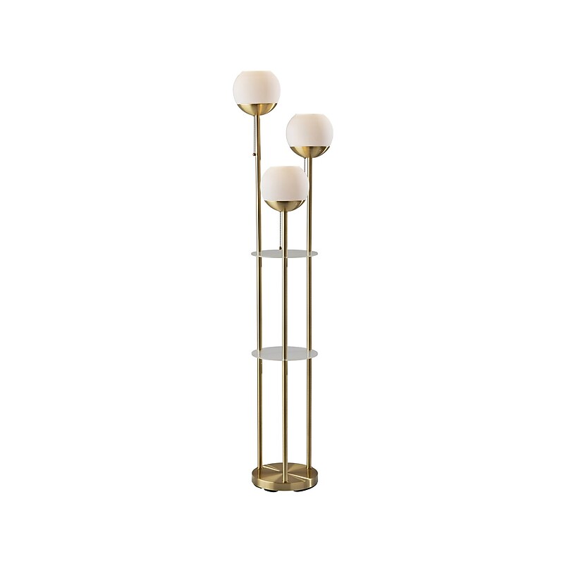 Bring a blend of style and function to your space with the Adesso Bianca floor lamp. Featuring two 10"Dia. frosted acrylic shelves, this lamp provides storage and display opportunities. The bottom shelf has a clearance of 34. 75", making it a perfect place to display vases, picture frames, or other taller items, while the 20" clearance for the top shelf makes it great for placing drink glasses, phones, or other smaller pieces. The 10" metal base in anfinish makes for a sturdy design, while the three poles of varying heights arranged in a triangular pattern rise cleanly to three lighting heads for an eye-catching design. The three 7" globe shades made of white opal glass complement the shelving and can be operated separately with pull chains, allowing you to control the amount of lighting. Each of the three globe shades ensconce 40W bulbs (not included). The lamp also features a 5' clear cord. Also available in a brushed steel finish. Bring a blend of style and function to your space with this floor lamp. Works with three 40W incandescent or 16W LED E26 bulbs. Overall dimensions: 63"H x 17"W x 17"D; base size: 10"Dia. ; shade size: 7"Dia. Made of metal in anfinish with two 10"Dia. frosted acrylic shelves. Three 7" globe shades are made of white opal glass that complement the shelving. Features a 60" clear cord. Each of the bulbs can be operated separately with pull chains, allowing you to control the amount of lighting. Shelves provide storage and display opportunities. Meets or exceeds the ETL standard.