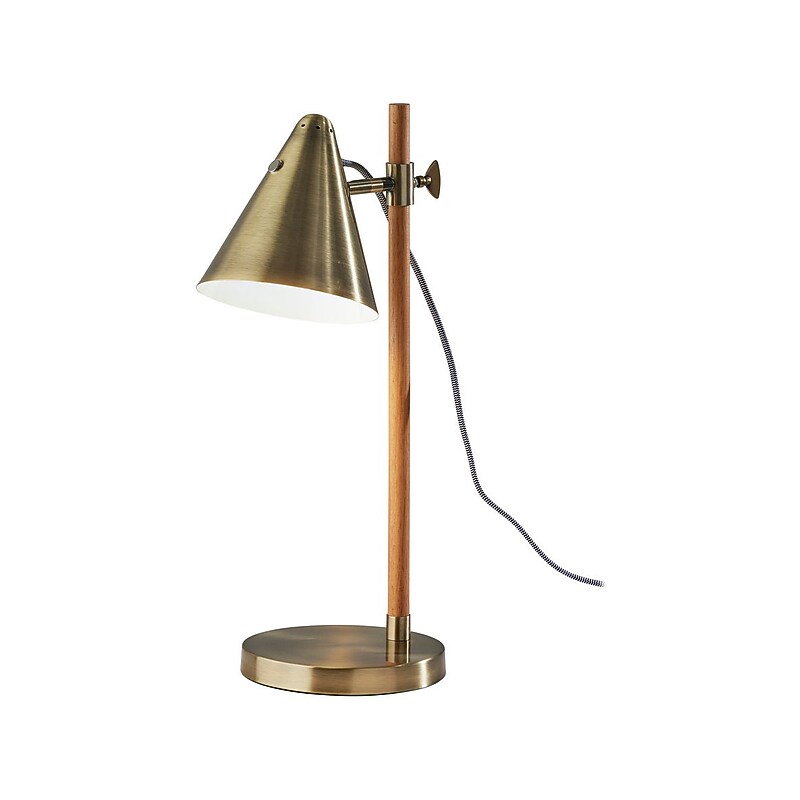 The clean, retro design of the 20"H Adesso Bryn desk lamp brings a sense of vintage chic to any space. The round base with an antique brass finish, matching metal cone-shaped head, and contrastingstand to highlight the antique look to bring a stylish energy that is perfect for desks, nightstands, counters, and more. The shade adjusts up and down the pole to set the desired shade height for the task at hand. Operated by a touch switch located on the metal shade to easily turn it on or off, the Bryn desk lamp powers a 40W Type A bulb (not included) for a perfect level of brightness and features a 7' fabric-covered cord in black and white. Pair it with the coordinating Bryn floor lamp to complete your decor. Stylish desk lamp in a clean, retro design is the perfect addition to your home or office desk space. Works with a 40W Type A bulb or 9W LED bulb (bulb not included). Overall dimensions: 20"H x 7"W x 10. 5"D; shade size: 7. 5"H x 6. 25"Dia. ; base size: 1"H x 7. 25"Dia. Round base with an antique brass finish, matching metal cone-shaped head, and contrastingstand highlight the antique look. Features a 84" black/white fabric-covered cord. Operated by a touch switch located on the metal shade to easily turn the lamp on or off. Shade adjusts up and down the pole to set the desired shade height for the task at hand. Pair it with the coordinating Bryn floor lamp to complete your decor. Meets or exceeds the ETL standard.