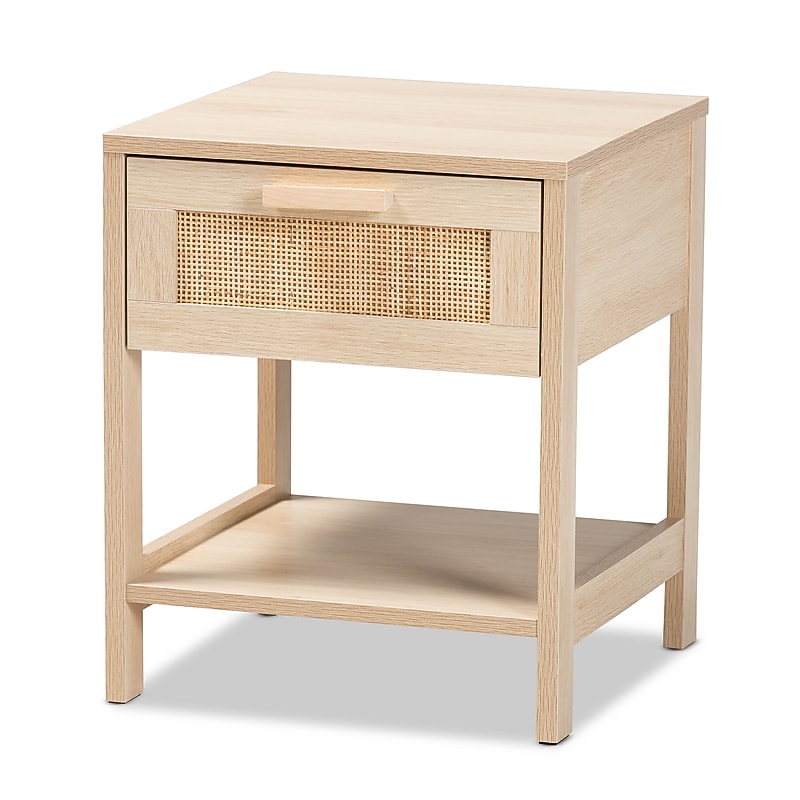 Dressed in the timeless aesthetic of the mid-century, the Sebille nightstand is an attractive yet versatile bedside accessory. Made in China, this handy piece is comprised of a sturdy wood frame adorned with natural rattan accents. Its drawer offers space to organize bedroom essentials and reserve the tabletop for nightly use. Requiring assembly, the Sebille features an open shelf that accommodates larger items. Carrying the appeal of classic design to the modern era, the Sebille nightstand fits right at home in any bedroom layout. Due to the nature of the natural materials used in this product, it may have variations in areas such as, but not limited to, color, pattern, grain and texture. The hair-like strands of rattan/rattan-fiber are common due to nature of the material. Straight legs. Constructed from Particle Board, MDF and Natural Rattan. One (1) drawer. One (1) open shelf. Natural rattan accents. Assembly required. Made in China. Overall Dimensions: 18. 90" High x 15. 70" Wide x 15. 70" Deep; Drawer Dimensions: 13. 80" Wide x 12. 40" Deep x 3. 00" High; Open Shelf Dimensions: 14. 20" Wide x 16. 10" Deep x 7. 90" High; Table Top: 0. 60" thick; Legs: 3. 40" High;. Baxton Studio offers a 30-Day parts replacement warranty on all items. If you experience any issue with your product, please contact us ordersupport@wholesale-interiors. com. ⚠ WARNING: California Proposition 65 Warning. This product can expose you to chemicals including lead, which are known to the State of California to cause cancer and birth defects or other reproductive harm. For more information go to www. P65Warnings. ca. gov.