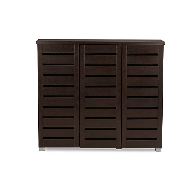 Start organizing your collection of shoes with this practical shoe cabinet. FeaturingPU veneer finish, PVC legs in silver powder coated and a sleek stylish contemporary design, this quality made shoe cabinet easily matches any dcor. It features slatted doors and four fixed shelves that stores up to 20 pairs of shoes. Great for organizing your favorites, just perfect for your storage needs! Adalwin shoe storage cabinet is made with open slat doors allowing air circulation which is essential for the storage of shoes helping to keep them mold free. Made in Malaysia, the shoe storage cabinet requires assembly. Finish: Dark brown finish. 3-door version comes with 5 larger shelves on the right and 5 smaller shelves on the right. 3-door version fits up to 20 pairs. Slatted doors for ventilation. Suitable for hallway. Overall Dimensions: 38. 34" High x 44. 46" Wide x 13. 1" Deep; Larger Shelf Dimensions: 28. 00" Wide x 9. 25" Deep x 6. 93" High; Smaller Shelf Dimensions: 14. 00" Wide x 9. 25" Deep x 6. 93" High; Legs: 1. 5" High;. Baxton Studio offers a 30-Day parts replacement warranty on all items. If you experience any issue with your product, please contact us ordersupport@wholesale-interiors. com. ⚠ WARNING: California Proposition 65 Warning. This product can expose you to chemicals including lead, which are known to the State of California to cause cancer and birth defects or other reproductive harm. For more information go to www. P65Warnings. ca. gov.