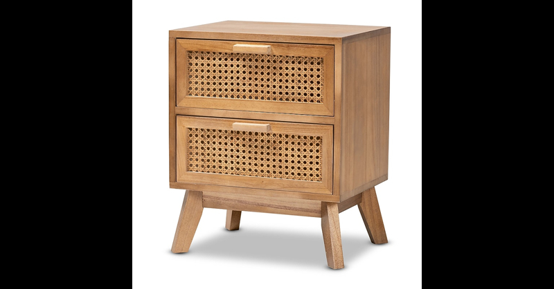 The stunning, retro-inspired design of the Baden nightstand elevates the capabilities of your nighttime routine. Made in China, this remarkable piece is crafted from sturdy wood and adorned with woven rattan drawer faces. Two drawers provide ample storage space for your nightly needs and reserve the tabletop for daily use. Requiring assembly, the Baden utilizes sleek, angled legs for stable support that lends classic charm. A fantastic solution for lively homes, the Baden nightstand develops the modern bedroom. This is a product of nature and may have variations in areas such as, but not limited to, color, pattern, grain and texture. The hair-like strands of rattan/rattan-fiber are common due to nature of the material. Rectangular tabletop. Constructed from Paulownia wood, MDF and natural rattan. Two (2) drawers. Woven rattan drawer faces. Angled legs. Assembly required. Made in China. Overall Dimensions: 19. 70" High x 15. 70" Wide x 11. 80" Deep; Drawer Dimensions: 14. 20" Wide x11. 00" Deep x 6. 10" High; Legs: 5. 90" High;. Baxton Studio offers a 30-Day parts replacement warranty on all items. If you experience any issue with your product, please contact us ordersupport@wholesale-interiors. com. ⚠ WARNING: California Proposition 65 Warning. This product can expose you to chemicals including lead, which are known to the State of California to cause cancer and birth defects or other reproductive harm. For more information go to www. P65Warnings. ca. gov.