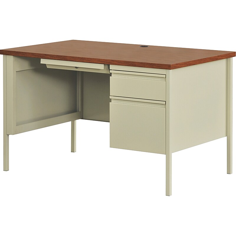 Commercial grade metal desks are perfect for business, educational or personal offices. These desks are constructed with high quality durable materials that are suitable for heavy use. Standard features include: full extension ball-bearing slides for smooth drawer action, central locking center drawer, and a durable laminate work surface. Desk ships fully assembled except for the legs. Hardware to attach legs is included. All desks are designed to meet or exceed ANSI-BIFMA industry standards for performance and workmanship and are backed by a Limited Lifetime Warranty. Rectangular computer desk great for business, government, and education applications. Constructed of high-quality steel color with laminate work surface in an oak finish. Dimensions: 29. 5"H x 48"W x 30"D. Keep important papers and personal belongings secure with one box and one file drawers, plus central locking center drawer. Features a single right-handed pedestal. Grommet holes provide easy access to wall outlets and hide your cords from view. Desk ships fully assembled except for the legs, hardware to attach the legs is included. Meets or exceeds the ANSI/BIFMA, GREENGUARD Gold standards. Full extension on file and box drawers. Central lock system locks all drawers. Work surface is easy to clean and disinfect. Extended drawer fronts with full-width pulls. Contains up to 30% recycled material. Lifetime limited manufacturer warranty; 12-year warranty on laminated surfaces. The ultimate solution for Industrial, Office, School, or Small Office Settings! Featuring a durable wood top and convenient filing storage, this desk offers both style and functionality. Easy assembly and long-lasting durability make It ideal for busy environments. Locking mechanisms you can trust for the security of your valuable items.