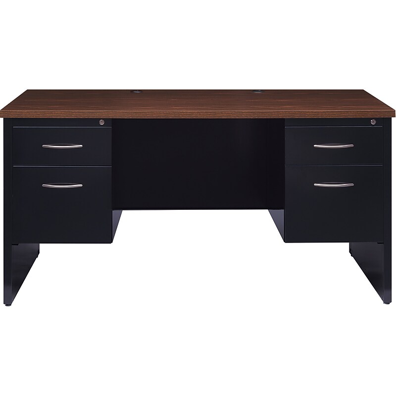 Modular double pedestal desk. Includes a core removable lock and Central locking system. Box and file drawers feature full extension slides and premium satin nickel Arch pull handles. Precision ball-bearing suspension. Durable laminate work surface with grommet holes for cord management. Radiuses profile edge banding for enhanced comfort. Full height end panels with leveling glides. One pencil tray standard per desk and one drawer divider standard per box drawer. Meets or exceeds ANSI-BIFMA standards and contains up to 28 percent recycled material. This desk is a part of our Executive Modular Desk Collection. Rectangular double-pedestal computer desk fits any workspace. Modern-style desk made of durable laminate with the work surface in a walnut finish. Dimensions: 29. 5"H x 60"W x 30"D. Keep important papers and personal belongings secure with two box drawers and two file drawers. Box and file drawers feature full-extension slides and premium satin nickel arch pull handles. Desktop includes two grommet holes for cord management. No assembly required. Meets or exceeds the GREENGUARD Gold, TAA, CARB/TSCA, and ANSI/BIFMA standards. One pencil tray per desk and one drawer divider per box drawer. Features full-height end panels with leveling glides and radiuses, plus profile edge banding for enhanced comfort. Includes two locks with removable cores and central locking system. 1. 13" thick durable laminate work surface is easy to clean and disinfect. Contains up to 30% recycled material. 12-year manufacturer limited warranty. The ultimate solution for Industrial, Office, School, or Small Office Settings! Featuring a durable wood top and convenient filing storage, this desk offers both style and functionality. Easy assembly and long-lasting durability make It ideal for busy environments. Locking mechanisms you can trust for the security of your valuable items.