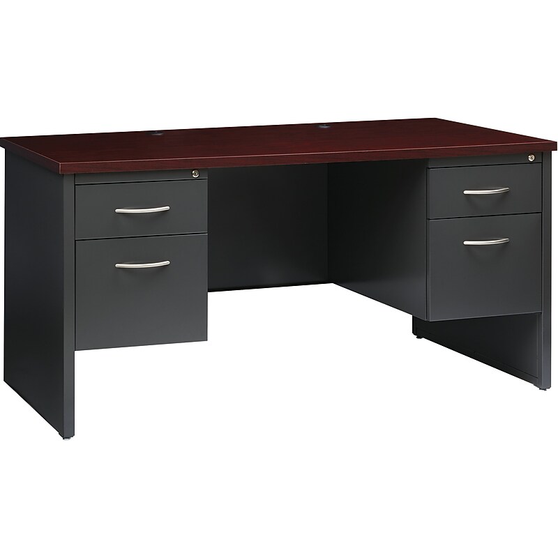 Modular double pedestal desk. Includes a core removable lock and Central locking system. Box and file drawers feature full extension slides and premium satin nickel Arch pull handles. Precision ball-bearing suspension. Durable laminate work surface with grommet holes for cord management. Radiuses profile edge banding for enhanced comfort. Full height end panels with leveling glides. One pencil tray standard per desk and one drawer divider standard per box drawer. Meets or exceeds ANSI-BIFMA standards and contains up to 28 percent recycled material. This desk is a part of our Executive Modular Desk Collection. Rectangular double-pedestal computer desk fits any workspace. Modern-style desk made of durable laminate in afinish with the work surface in a mahogany finish. Dimensions: 29. 5"H x 60"W x 30"D. Keep important papers and personal belongings secure with two box drawers and two file drawers. Box and file drawers feature full-extension slides and premium satin nickel arch pull handles. Desktop includes two grommet holes for cord management. No assembly required. Meets or exceeds the GREENGUARD Gold, TAA, CARB/TSCA, and ANSI/BIFMA standards. One pencil tray per desk and one drawer divider per box drawer. Features full-height end panels with leveling glides and radiuses, plus profile edge banding for enhanced comfort. Includes two locks with removable cores and central locking system. 1. 13" thick durable laminate work surface is easy to clean and disinfect. Contains up to 30% recycled material. 12-year manufacturer limited warranty. The ultimate solution for Industrial, Office, School, or Small Office Settings! Featuring a durable wood top and convenient filing storage, this desk offers both style and functionality. Easy assembly and long-lasting durability make It ideal for busy environments. Locking mechanisms you can trust for the security of your valuable items.