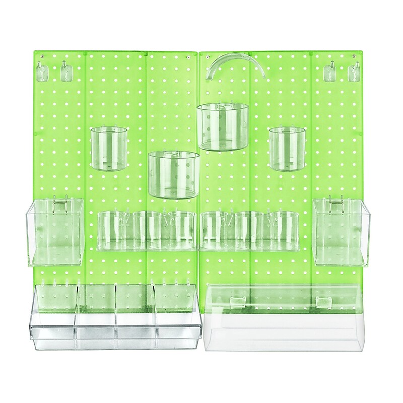 Organize any space with the Azar 24-piece double-pegboard organizer kit. Get organized and declutter any space with this multipurpose accessory kit. Perfect to organize hair accessories, jewelry, cosmetics, trinkets, art supplies, and electronics. The possibilities are endless with this pegboard accessory set: use it in your home, craft room, playroom, basement, dorm room, teen room, garage, storage room, kitchen, garage, shed, workshop, office, or retail environment. The Azar organizer kit is the perfect solution to help you declutter and get organized. Double-pegboard organizer kit perfect for use in your home, retail environment, workshop, office, garage, shed, basement, and more. Made of high-impact styrene for strength and durability in translucentwith transparent accessories. Each panel dimensions: 22"H 13. 5"W 0. 88"D; combined size: 22"H 27"W 0. 88"D. Simply mount the pegboard panels to any flat surface, then arrange the hooks and pegboard accessories assortment to your preference. Kit includes: two perforated plastic pegboard wall panels, four 2" clear plastic hooks, two 3"Dia. cups, two 4"Dia. cups, two three-cup trays, acrylic bin, three dividers for the bin, acrylic headband holder, half-round bar, two 4" cube bins, and four drywall screws with anchors. Can also be used in retail stores to present your customers with a plethora of impulse buy items with easy accessibility and visual appeal.