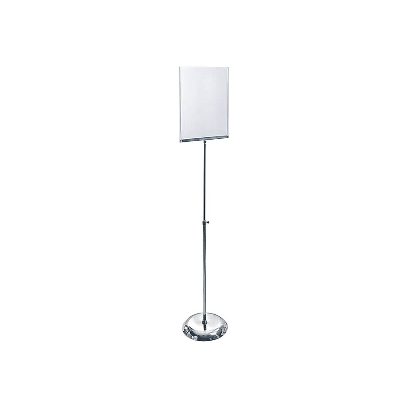 The Azar pedestal two-sided sign holder stand on a round metal base is perfect to display graphics, advertisements, promotions, and social distancing messages in stores, lobbies, hospitals, medical facilities, schools, offices, cafes, or anywhere a sign is needed. With a small footprint, the holder allows you to get your message or promotional information right in front of your target audience. The unit comes standard with a double-sided acrylic frame, metal pole, and sturdy metal base with rubber bumpers on the bottom. Featuring an easy-to-assemble construction and top-loading design, this freestanding floor stand is an affordable and simple solution to your signage needs. Pedestal two-sided sign holder stand is perfect to display graphics, advertisements, promotions, and social distancing messages anywhere a sign is needed.acrylic frame, metal pole and round metal base in a shiny silver-tone finish with rubber bumpers on the bottom. Holds pages with portrait orientation. Overall dimensions: 24"-45""H 15"Dia. Graphics size: 17". Metal base ensures stability. 11"W 17"HAcrylic Sign Holder with Metal Pedestal Stand.