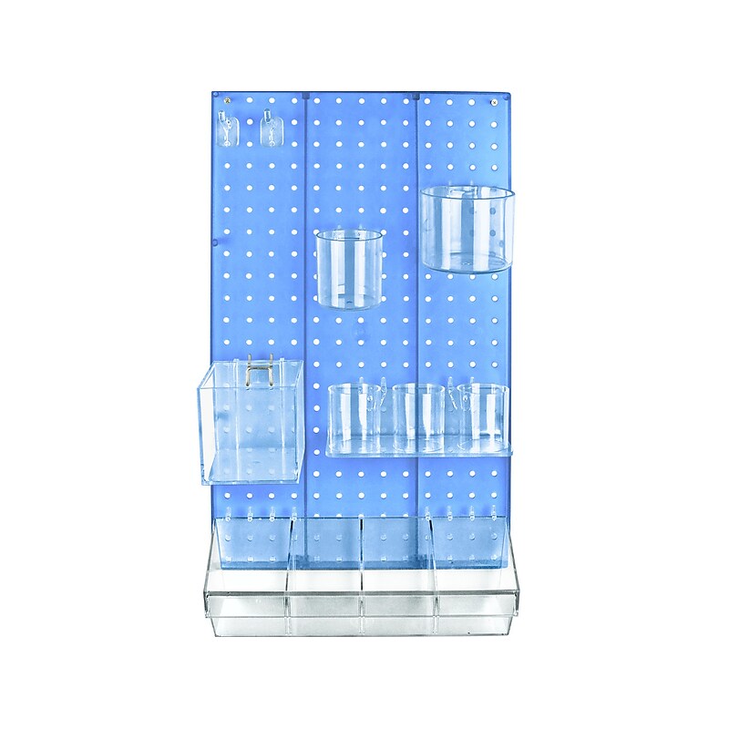 Organize any space with the Azar 12-piece pegboard organizer kit. Get organized and declutter any space with this multipurpose accessory kit. Perfect to organize hair accessories, jewelry, cosmetics, trinkets, art supplies, and electronics. The possibilities are endless with this pegboard accessory set: use it in your home, craft room, playroom, basement, dorm room, teen room, garage, storage room, kitchen, garage, shed, workshop, office, or retail environment. The Azar organizer kit is the perfect solution to help you declutter and get organized. Pegboard organizer kit perfect for use in your home, retail environment, workshop, office, garage, shed, basement, and more. Made of high-impact styrene for strength and durability with transparent accessories. Dimensions: 22"H 13. 5"W 0. 88"D. Simply mount the pegboard panel to any flat surface, then arrange the hooks and pegboard accessory assortment to your preference. Kit includes: perforated plastic pegboard wall panel, two 2" clear plastic hooks, 3"Dia. cup, 4"Dia. cup, three-cup tray, acrylic bin, three dividers for bin, 4" cube bin, and pack of drywall screws with anchors. Can also be used in retail stores to present your customers with a plethora of impulse buy items with easy accessibility and visual appeal.