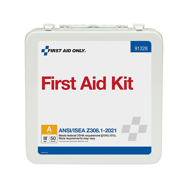 The kit contents meet both the ANSI and OSHA standards and are sufficient to treat up to 50 people. The metal weatherproof storage case has two latches to keep the case closed and a handle to facilitate transportation to the site of an injury. The case also includes tabs for mounting the case on a wall or other flat vertical surface. ANSI Class A Type III first aid kit in a metal case with essential first aid supplies. Contains 184 pieces to treat minor injuries, sufficient to treat up to 50 people. Case also includes tabs for mounting on a wall or other flat vertical surface. OSHA compliant with essential first aid supplies. Perfect for large offices, restaurants, grocery stores, industrial sites, and more. Compact and portable in a weatherproof Type III metal case. First aid supplies are efficiently packed in easy-to-access compartments to expedite response time in an emergency. 9. 5"x9"2. 63" Metal Case. The 50-person ANSI Class A first aid kit in a metal case by First Aid Only contains 184 pieces to treat minor injuries.