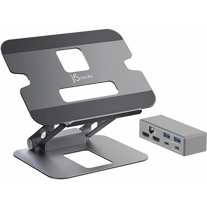 Made of durable aluminum, this j5create multi-angle stand can support a variety of items in addition to a laptop, including tablets, books, etc. The foldable design allows for easy storage or transport, while the viewing angles and heights can be adjusted to fit your needs and optimize your viewing experience. This versatile stand gives you the ability to create a more efficient workspace, whether you need extra space or a standing desk setup. The integrated USB Type-C mini dock lets you easily create a workstation with one 4K HDMI or dual 1080p HDMI display outputs, a Gigabit Ethernet port for easy network access, and two 5Gbps USB Type-A downstream ports, as well as a USB Type-C port that supports 5Gbps data transfer rate and up to 100W pass-through, providing all the connectivity you need for enhanced productivity and to connect your peripherals. Multi-angle stand can support a variety of items in addition to a laptop, including tablets, books, and more. Made of durable aluminum and silver colors. Dimensions: 2. 08"H 11. 4"W 8. 9"D (folded). Fits most laptops up to 16". Aluminum construction provides a weight capacity of up to 9 lbs. Adjustable viewing angles and heights help reduce eyestrain and improve posture. Nonslip protective pads help prevent slipping and scratches. Foldable design for easy storage and portability. Supports 4K HDMI or dual 1080p HDMI displays on compatible USB Type-C laptops with DisplayPort 1. 2 Alt Mode with MST support. Integrated USB Type-C mini dock features 1 4K HDMI output and 3 USB SuperSpeed 5Gbps ports. Easily create a 4K HDMI or dual 1080p HDMI setup with your Thunderbolt 3/4 or USB Type-C laptop with DP Alt Mode. 2 5Gbps Type-A ports for data transfer and syncing or charging your USB devices. One USB Type-C port with 5Gbps data transfer rate and support for 100W power pass-through. Reliable network connectivity via the Gigabit Ethernet port. 2-year manufacturer limited warranty.