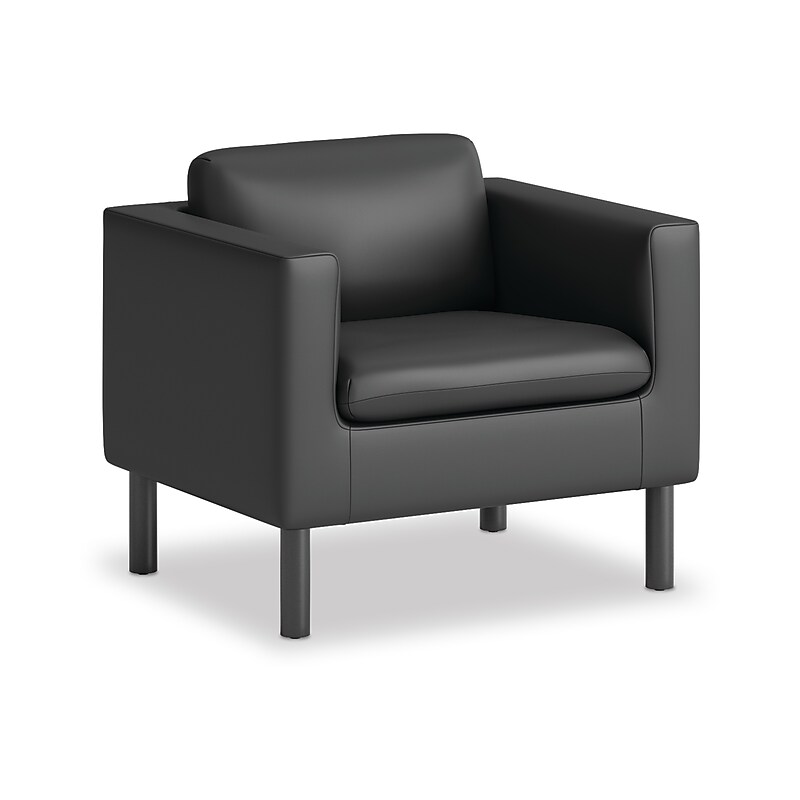 The HON Parkwyn club chair offers soft comfort, ample support, and clean lines in a cozy reception area to welcome guests, or in a shared space for collaboration. This soft seating solution provides smart sophistication with a budget-friendly bottom line. Make your space work with Parkwyn. Creates a stylish and comfortable getaway in lounge and open areas for everyone to get together. Upholstered in soft and durablepolyurethane. Overall dimensions: 29"H x 33"W x 26. 75"D. Seat dimensions: 17. 5"H x 22. 5"W x 18"D. Back dimensions: 11. 5"H x 33"W. Features upholstered fixed arms. Assembly required. Adapts to any type of work setting with a soft, contoured profile. Back cushion removes quickly for easy cleaning. Offers a contemporary look and easy cleaning underneath the tall legs. Meets or exceeds the HON quality standards. 5-year manufacturer limited warranty. Model Option: HVLVL1. BLK01.