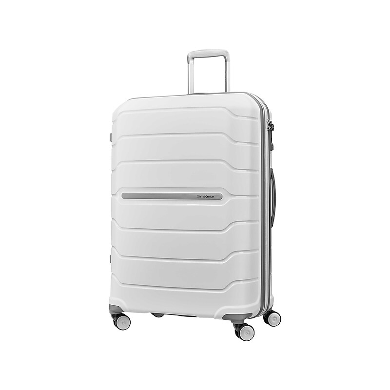 Extremely lightweight and durable, the Samsonite Freeform has been created to bring the strength and maneuverability our customers have come to expect combined with a truly unique design. With a more streamlined panel, an increased packing capacity, and thoughtfully integrated components, this lightweight carry-on offers a very spacious and effortless ride. Made of injection-molded polypropylene Zipper closure and TSA three-dial combination recessed lock keep items safe and secure. Overall dimensions: 31. 1"H x 20. 95"W x 13. 8"D. Features a cross ribbon and divider for easy packing, plus multiple pockets for managing belongings during travel. Integrated multistage aluminum pull handle for extra lightness. Retracting top and side carry handles remain protected when checking baggage. Recessed metal logo plate for a modern look. Double 360-degree wheels to increase maneuverability. Includes a built-in ID tag. Expandable for added capacity. Internal dimensions: 27. 6"H x 20"W x 13"D. Weight: 9. 59 lbs. 10-year manufacturer limited warranty. ⚠ WARNING: This product can expose you to chemicals including Di(2-ethylhexyl) phthalate (DEHP), which is known to the State of California to cause cancer and birth defects or other reproductive harm. For more information go to www. P65Warnings. ca. gov.