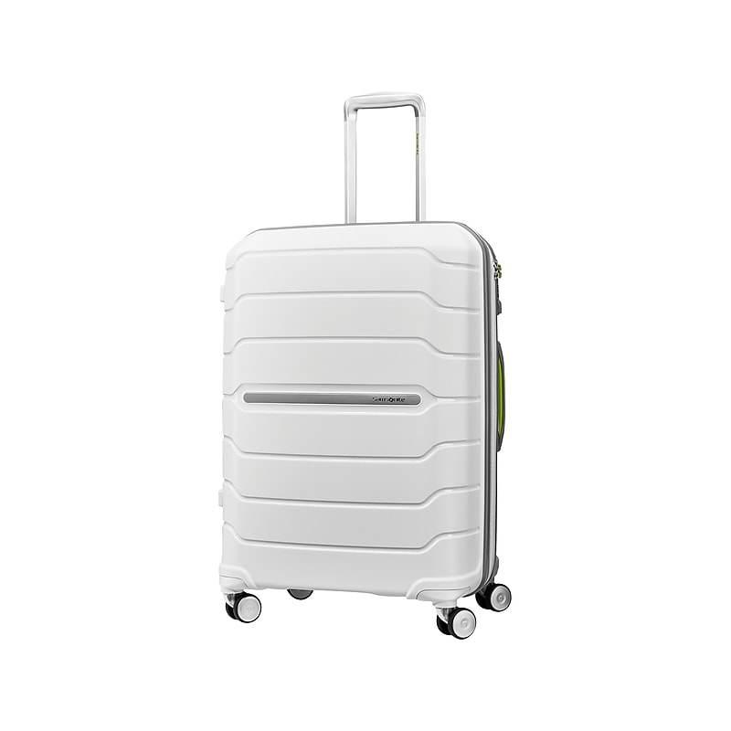 Extremely lightweight and durable, the Samsonite Freeform has been created to bring the strength and maneuverability our customers have come to expect combined with a truly unique design. With a more streamlined panel, an increased packing capacity, and thoughtfully integrated components, this lightweight carry-on offers a very spacious and effortless ride. Made of injection-molded polypropylene gray. Zipper closure and TSA three-dial combination recessed lock keep items safe and secure. Overall dimensions: 27. 95"H x 19. 6"W x 13. 4"D. Features a cross ribbon and divider for easy packing, plus multiple pockets for managing belongings during travel. Integrated multistage aluminum pull handle for extra lightness. Retracting top and side carry handles remain protected when checking baggage. Recessed metal logo plate for a modern look. Double 360-degree wheels to increase maneuverability. Includes a built-in ID tag. Expandable for added capacity. Internal dimensions: 24"H x 18"W x 11. 5"D. Weight: 8. 48 lbs. 10-year manufacturer limited warranty. ⚠ WARNING: This product can expose you to chemicals including Di(2-ethylhexyl) phthalate (DEHP), which is known to the State of California to cause cancer and birth defects or other reproductive harm. For more information go to www. P65Warnings. ca. gov.