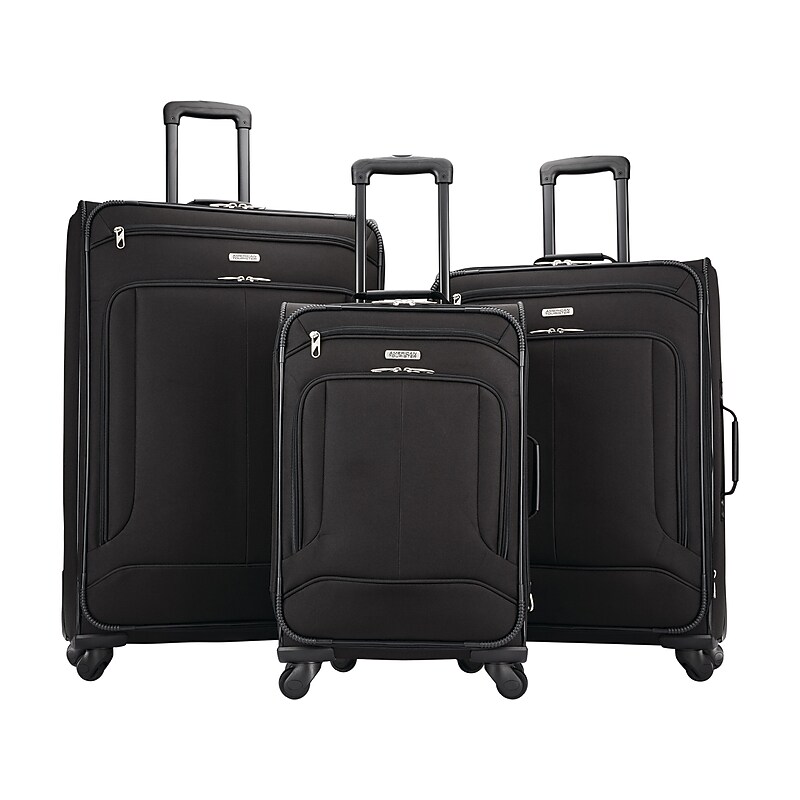 Designed to make your travel experience a breeze, the American Tourister Pop Max collection set consists of one 21", one 25", and one 29" spinners. This three-piece set features multiple organizational compartments and durable polyester construction for the smart and bold traveler. Durable polyester construction for the smart and bold traveler; cases come Padded top and side carry handles provide comfort when lifting a fully packed case. Overall dimensions: 24"H x 14"W x 8"D (carry-on), 28"H x 18"W x 8. 5"D (medium checked), 32"H x 20"W x 9. 5"D (large checked). This three-piece set features multiple organizational compartments. Cases expand for added packing capacity. Each case features four multidirectional spinner wheels for easy mobility. Rolls upright to reduce the weight on your arm. 10-year manufacturer limited warranty. ⚠ WARNING: This product can expose you to chemicals including Di(2-ethylhexyl) phthalate (DEHP), which is known to the State of California to cause cancer and birth defects or other reproductive harm. For more information go to www. P65Warnings. ca. gov.