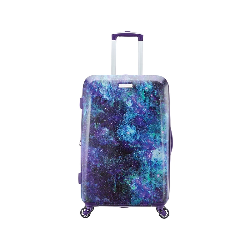 The American Tourister Moonlight hardside luggage was made for the traveler who brings whimsy and fun on every journey. This hardside suitcase is durable and easy to spot. This 24" spinner was designed for those who love a dash of fun, with great color choices to match your unique personality. This hardside luggage is lightweight and easy to maneuver with spinner wheels and a retractable handle. The suitcase opens book-style with compartments on both sides that offer a plenty of room. Shiny hardside ABS/polycarbonate suitcase with a multicolor cosmos pattern. Equipped with retractable-grip top and side carry handles. Overall dimensions: 27. 55"H x 17. 3"W x 11. 2"D. Split-case packing with two large compartments, a mesh blouse pocket on the zipper door panel, and colored pop straps. Beveled push-button locking handle that's easy to grip. Lightweight and easy to maneuver with single spinner wheels. Designed for those who love a dash of fun. Case expands 1. 5" for added packing capacity. Weight: 9. 04 lbs. 10-year manufacturer limited warranty. ⚠ WARNING: This product can expose you to chemicals including Di(2-ethylhexyl) phthalate (DEHP), which is known to the State of California to cause cancer and birth defects or other reproductive harm. For more information go to www. P65Warnings. ca. gov.
