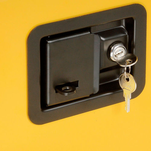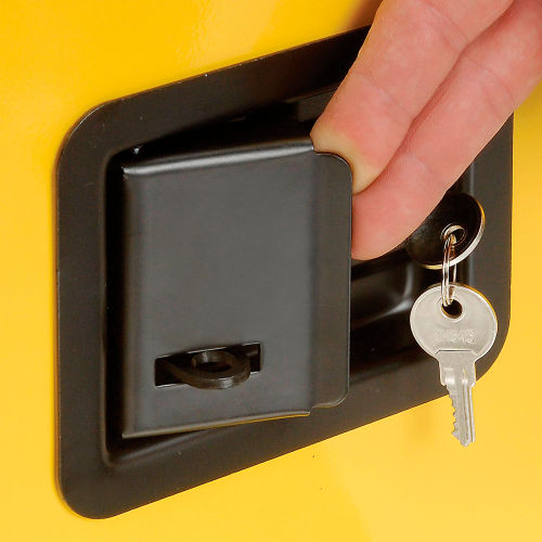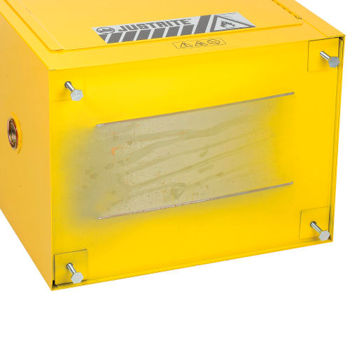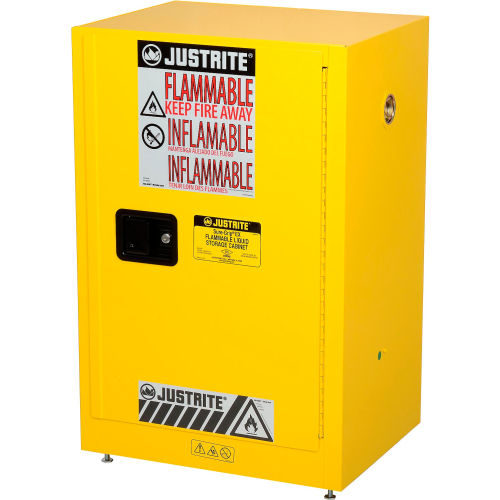 JUSTRITE FLAMMABLE CABINETS Compact Cabinet - Gallon Capacity - Manual Close Single Door This Justrite flammable safety cabinet stores flammable liquids safely even when minimal space is available. Double walled 18-gauge all-welded steel with 1 1/2" insulating air space. The dual 2" vents of this flammable cabinet allows connecting to an exhaust system. Safety cabinet has a 2"D leak proof doorsill. The 350 lb galvanized steel shelves of this flammable liquid cabinet adjusts at 3" increments and feature a SpillSlope design that direct spills to back and bottom of safety cabinet. Doors have full length piano hinges. Justrite Flammable Cabinet has a recessed paddle handle with cylinder lock and padlockable latch for security. Stainless steel 3-point self-latching system provides positive door locking. This safety storage cabinet includes a built in grounding connector. Adjustable leveling feet for uneven floors. Durable powder coat finish with Haz-Alert trilingual reflective warning label provides high visibility. Complies with the National Fire Protection Association Flammable Combustible Liquid Code #30 and OSHA standard 1910.106 for flammable storage of 1, 2 and 3 liquids. FM approved. 10 Year Limited Warranty. Some state and municipalities may require self-closing doors on flammable safety cabinets. This cabinet has manual closing doors, please review your local ordinances prior to purchasing.