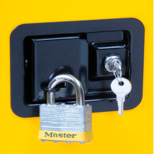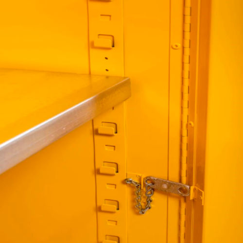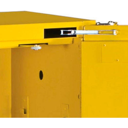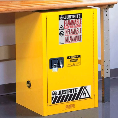 JUSTRITE FLAMMABLE CABINETS Compact Cabinet - Gallon Capacity - Self-Close Single Door This Justrite flammable safety cabinet stores flammable liquids safely even when minimal space is available. Double walled 18-gauge all-welded steel with 1 1/2" insulating air space. The dual 2" vents of this flammable cabinet allows connecting to an exhaust system. Safety cabinet has a 2"D leak proof doorsill. The 350 lb galvanized steel shelves of this flammable liquid cabinet adjusts at 3" increments and feature a SpillSlope design that direct spills to back and bottom of safety cabinet. Doors have full length piano hinges. Justrite Flammable Cabinet has a recessed paddle handle with cylinder lock and padlockable latch for security. Stainless steel 3-point self-latching system provides positive door locking. This safety storage cabinet includes a built in grounding connector. Adjustable leveling feet for uneven floors. Durable powder coat finish with Haz-Alert trilingual reflective warning label provides high visibility. Complies with the National Fire Protection Association Flammable Combustible Liquid Code #30 and OSHA standard 1910.106 for flammable storage of 1, 2 and 3 liquids. FM approved. Self-Close Flammable Cabinets have a fusible link that melts at 165 releasing the closing mechanism in the event of a fire. Features a concealed self-close mechanism. 10 Year Limited Warranty.