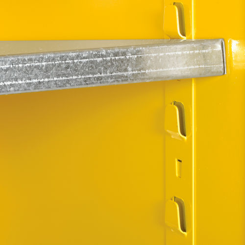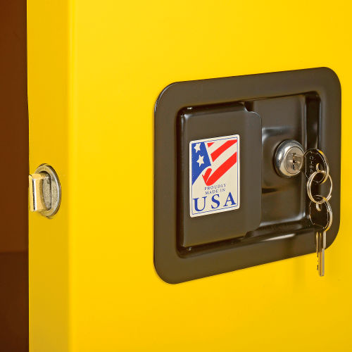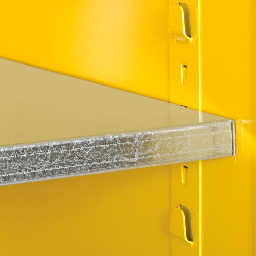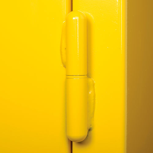 Flammable Cabinet - Gallon - Manual Close Double Door - 43"W x 34"D x 65"H Flammable cabinets meet or exceed the NFPA Flammable Liquid Code #30 and the OSHA standard 1910.106 for storage of class I, II and III liquids. FM approved. All-welded construction provides additional strength and 18 gauge cabinet with 14 gauge doors. offers additional fire protection. The double-walled design of these Flammable cabinets allows 1-1/2" insulating air space and dual 2" air vents that connect to exhaust system to maintain safe temperatures. Built-in grounding connector and leveling feet. 350 lb. capacity shelves adjust easily on 2-1/2" centers. Doors are equipped with 4" hinges with sturdy brass pins and feature a spill-proof sill, a flush paddle handle with 3 point latching and a highly visible trilingual warning. Latching engages when doors are closed without handle rotation. This Manual Close Door. model does not close automatically - doors will only latch when they are manually closed. Flush door handle prevents passersby from catching or banging. Flammable cabinets are finished with yellow powder coat and feature radius edges for safety. Depth with hinge is 35-1/2". 12 Year Limited Warranty.