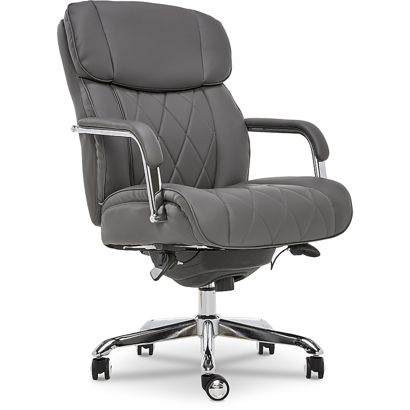 Complete the stylish look of your desk or home office space with the La-Z-Boy Sutherland bonded leather office chair. The Sutherland is upholstered bonded leather and features stylish quilted stitching accents along the back and seat. Beautiful quilted stitching accents and generously padded headrest, arms, seat, and back add a sense of luxury to the modern, feminine design of this desk chair. The La-Z-Boy Sutherland office chair is perfect for positioning at your office desk, and the contoured lumbar will stay comfortable and supportive during long hours at work. The five casters allow the chair to glide easily, and the pneumatic seat height adjustment allows you to find your optimal comfort level. Live life comfortably with the La-Z-Boy Sutherland leather office chair. Luxurious and stylish, this computer and desk chair can be used anywhere. Gray bonded leather upholstery with modern stitching accents complements the polished chrome base. Plush cushioning on headrest, arms, seat, and back for perfect ergonomic comfort. Product Dimensions: 40. 5-43. 5"H x 23. 5"W x 29. 5"D. Seat dimensions: 19. 5"-22. 5"H x 18"D. Back dimensions: 27"H x 21"W. Fixed padded arms for supporting your forearms. Swivel tilt for comfort. Rated weight capacity: up to 250 lbs. Full assembly required. Five casters for easy gliding. Pneumatic seat height adjustment is easily customizable. 1-year manufacturer limited warranty on cushions and components. Meets or exceeds ANSI/BIFMA standards.