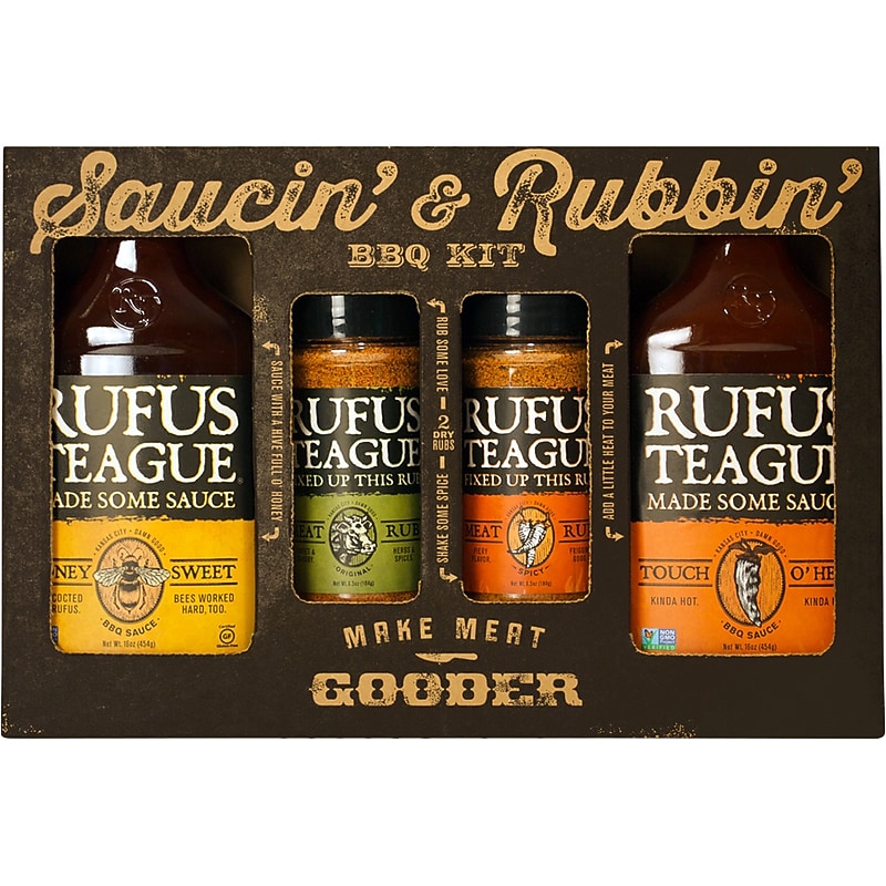 This Alder Creek Rufus Teague BBQ kit makes a tasty gift for the grill master in your life. Packed with two flavors of BBQ sauce, one mild meat rub, and one spicy meat rub. BBQ kit makes a tasty gift for the grill master in your life. Includes: Honey Sweet BBQ sauce (16 oz. ), Touch O' Heat BBQ sauce (16 oz. ), Original meat rub (6. 5 oz. ), Spicy meat rub (6. 5 oz. ). All wrapped up in a gift box.