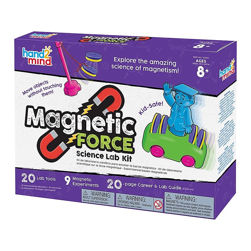 Explore the science behind magnets. Children learn the important concepts of magnetic force, levitation, and attraction as they race magnetic cars, build a maglev train and a working compass, and more. The hand2mind Magnetic Force kit also introduces children to different magnet-related STEM careers such as an electrical engineer, medical technician, and particle physicist. EDUCATIONAL TOYS: Welcome to the exciting world of magnets! Using the magnet kit, children can make magnets float without touching them, use magnetic levitation to move a train, and creating a compass. EASY TO USE: The 9 kids STEM experiments and 20 real lab tools allow your kids to explore the science behind magnetism. The kids can perform amazing experiments and experience what it's like to think like a scientist or an engineer. STEM kits are a fun way to work and learn through purposeful science-based play. LEARN & PLAY: STEM at play kits bring science concepts to life through hands-on activities designed to spark interest, inspire confidence, prompt creative critical-thinking skills while fostering collaboration between children and adults. STEM at play kits provides materials to support scholastic goals while keeping at-home learning fun. AT HOME STEM ACTIVITIES: The 20-page fact-filled colorful lab guide is jam-packed scientific principles, pictures, and information that will keep your kid busy with fun for HOURS in the comfort of your home. HANDS-ON LEARNING: STEM at Play kits prepares your kid for the STEM (Science, Technology, Engineering, Math) career by bringing science concepts to life through hands-on learning. Your child will learn new scientific facts and real STEM careers while having fun learning about the magnetic force. Introduces children to different magnet-related STEM careers such as an electrical engineer, medical technician, and particle physicist. Warning: choking hazard; due to small parts, not for children under three years.