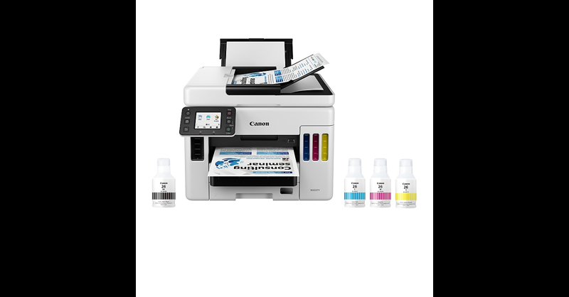 The MAXIFY GX7021 MegaTank printer is perfect for small businesses and home offices that demand high-volume low-cost printing with a high amount of versatility and dependability. Print more for less with MAXIFY MegaTank. All-in-one printer gives you printing, copying, and scanning capability. Resolution up to 1200 x 600 dpi for excellent readability. LAN, USB host, USB 2. 0, and Wi-Fi connectivity helps enhance productivity. Dimensions: 12. 4"H x 16. 2"W x 15. 8"D. Types of media supported: labels, magnetic photo paper, greeting cards, recycled paper, luster paper, high-resolution paper, matte photo paper, plain paper, restickable photo paper, envelopes. Fax memory accommodates up to 250 pages for snag-free operation. Single-pass duplex scanning allows for fast multipage scanning. Easily manage tasks with the 2. 7" touch screen. 1200 x 1200 dpi optical scan resolution, 8-bit color depth, 8-bit grayscale depth for good-quality printed text and images. Print speed (up to): 24 ipm black/15. 5 ipm color. Meets or exceeds the ENERGY STAR standard. 3-year manufacturer limited warranty.