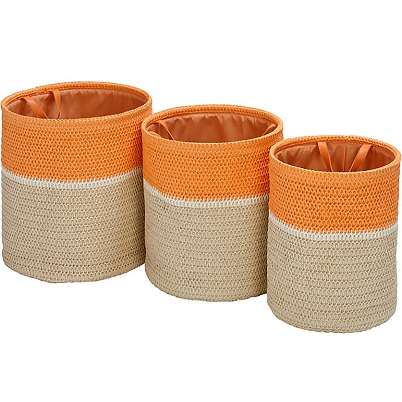 The Honey-Can-Do fun straw baskets can be used as everything from modern baby laundry hampers to toy or blanket storage bins, helping you organize the laundry room, add a boost of storage to the nursery, or hide away magazines and remotes in the living room - the options are endless. The double-handle design makes it simple to tote the baskets around the house. And when not in use, the baskets nest for convenient storage. The baskets are equally functional and stylish, with the textural paper straw weave sporting modern color blocking that brings a pop of color to your space. Nesting baskets to help you separate kids' colored and white laundry, organize the linen closet, or add a boost of storage to the nursery - the options are endless. Paper straw weave features a color blocking design and white for a pop of color. Basket dimensions: 16. 1"H x 14. 9"Dia. (large), 14. 9"H x 13. 7"Dia. (medium), and 14. 1"H x 11. 8"Dia. (small). Baskets nest when empty for convenient storage. Weight capacity: 5 lbs. per basket. Double handles make it simple to tote the baskets around the house. Liner is easy to wipe clean with a damp cloth. Baskets make great laundry room organizers, modern storage bins, toy baskets, laundry room bins, nursery hampers, kids storage, and more. Three baskets per set.