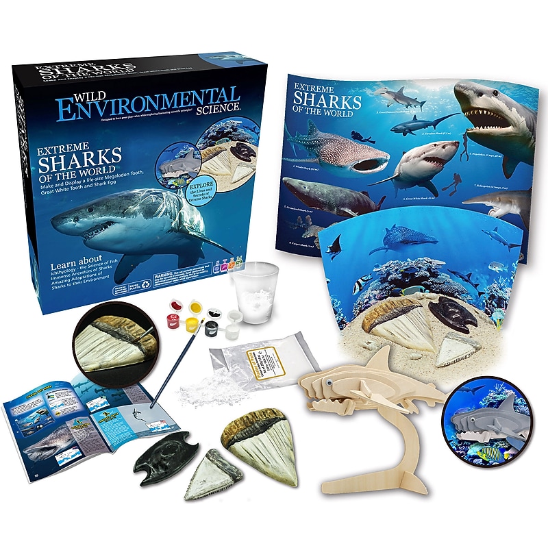 Extreme Sharks of the World is one of a series of collectible animal science kits. Use this kit to make a huge megalodon tooth, life-size great white shark tooth and life-size shark egg case. Assemble a detailed timber model of a great white shark. Build and decorate a reef diorama. Learn the amazing secrets of 10 of the worlds most extreme sharks. For kids aged 6+. Make and display a life-size Megalodon tooth, Great White tooth and shark egg. Learn about Ichthyology - the science of fish, ancestors of sharks and the amazing adaptations of sharks to their environment. This kit comes with a shark poster that kids can hang in their rooms. This kit features a clear, colored instruction booklet that kids can easily follow. This kit is perfect for science fairs, show and tell sessions, nature tables and more.