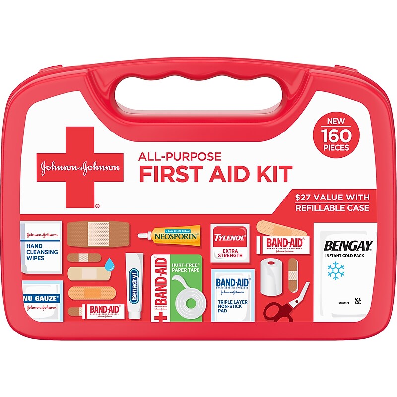 Ideal for cars, home, dorms, travel & outdoors. Case keeps items organized & accessible. 160-piece Johnson & Johnson All-Purpose Portable Emergency First Aid Kit is ideal for home, in cars, the classroom, dorm, & the office to help care for minor cuts, scrapes, burns, itches, pain, skin rashes & insect bites. All-purpose, compact first aid kit includes essential first aid supplies like cleansing wipes, gauze pads, assorted bandages, rolled gauze, antibiotic cream, itch stopping cream, acetaminophen caplets, an instant cold pack, and much more. Includes a variety of Band-Aid Brand Adhesive Bandages in assorted sizes for minor wound care, as well as Band-Aid Brand First Aid Products such as gauze, non-stick pads & tape for larger minor wounds, all organized in a durable & accessible box. Includes full size 0. 5 oz Neosporin + Pain Relief topical cream to help prevent infection while relieving pain & full size 1. 0 oz Extra Strength Benadryl Itch-Stopping topical cream to help soothe itching from rashes or insect bites. Travel first aid kit also contains Tylenol Extra Strength acetaminophen pain reliever caplets and a Bengay Non-Medicated Instant Cold Pack to help ease minor aches and pains, as well as two pairs of gloves and a helpful first aid guide. An essential workplace item for your breakroom or supply closet. Safety Data Sheet . All-purpose compact first aid kit with essentials for minor cuts, scrapes, burns, rashes & insect bites.