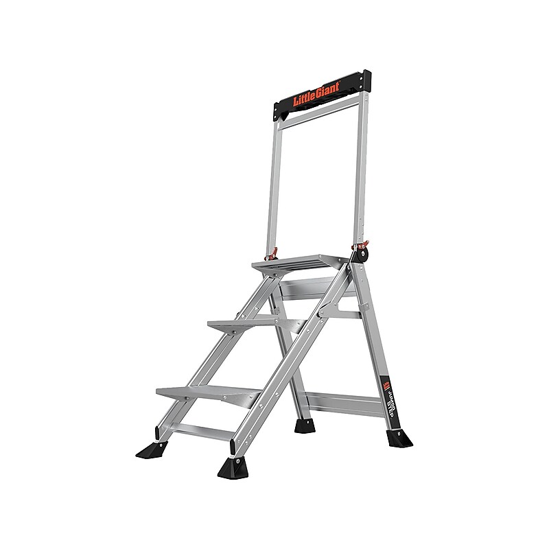 The stepladder offers an ultimate combination of light weight, stability, and strength. The safety bar is also a convenient tool tray. This stepladder is rated lbs. for professional, industrial, and household use. The large 3" x 2. 25" nonslip shoes provide great traction over almost any surface, including drains and grates. This Little Giant Ladder Systems Jumbo Step 3. 5' stepladder is simple to store with a 4. 5" storage depth. Stepladder for professional, industrial, and household use. Storage dimensions: 42"H x 21. 5"W x 4. 5"D; Step width: 8. 5". Weight capacity: lbs. Safety bar is also a convenient tool tray. Simple to store with a 4. 5" storage depth. Two-finger handrail release for easy handrail folding and adjustment. Fully anodized, increasing durability and preventing oxidation. Innovative top cap includes: dedicated cell phone holder, hooks for buckets or gallons of paint, two port holes for cordless drills or hammers, slots for extension cords or hoses, slots for screwdrivers and other hand tools, groove for conduit, PVC, or fluorescent bulbs, large tray for loose pieces such as nuts, bolts, or nails, grooves to fit 1 qt. of paint. Handrail in a center, upright position for increased comfort and stability. Non-marking ladder feet. Wide shoes provide traction above drains and grates while providing stability. Compatible with Little Giant Ladder Systems ladder rack. Meets or exceeds ANSI Type IAA standard. Limited lifetime manufacturer warranty.